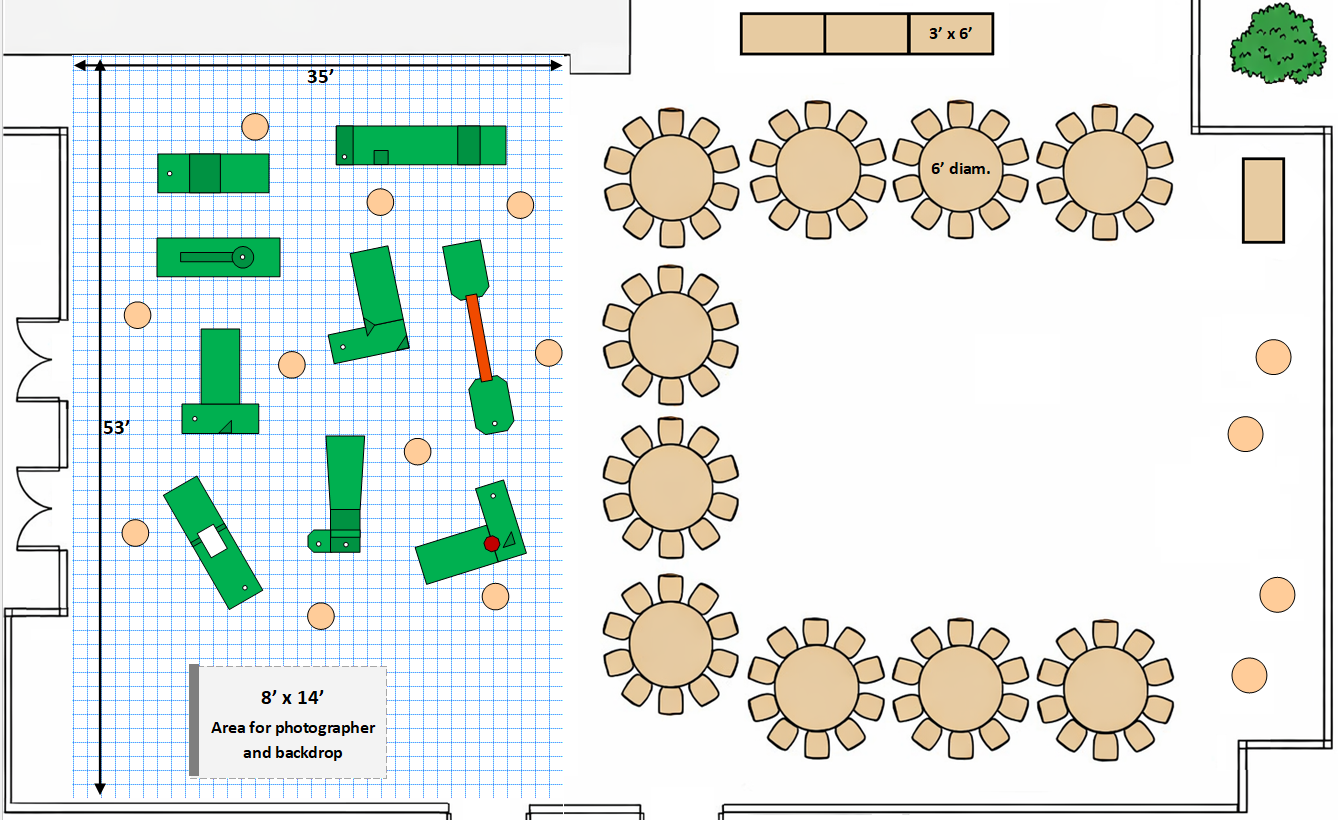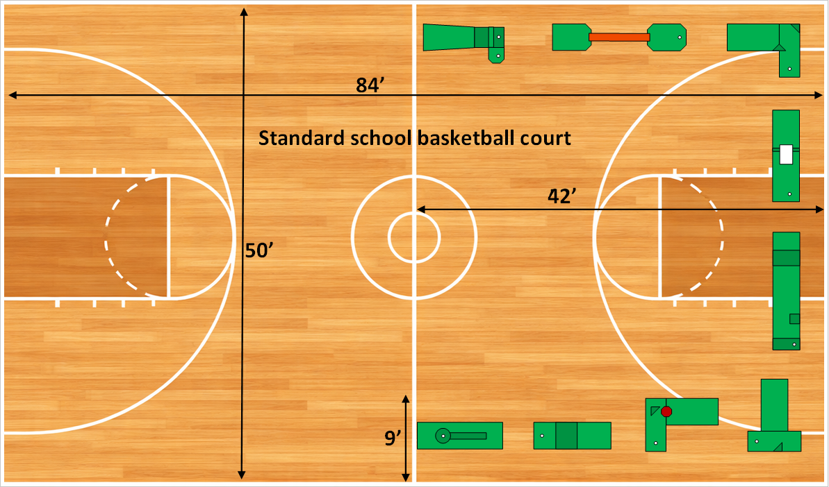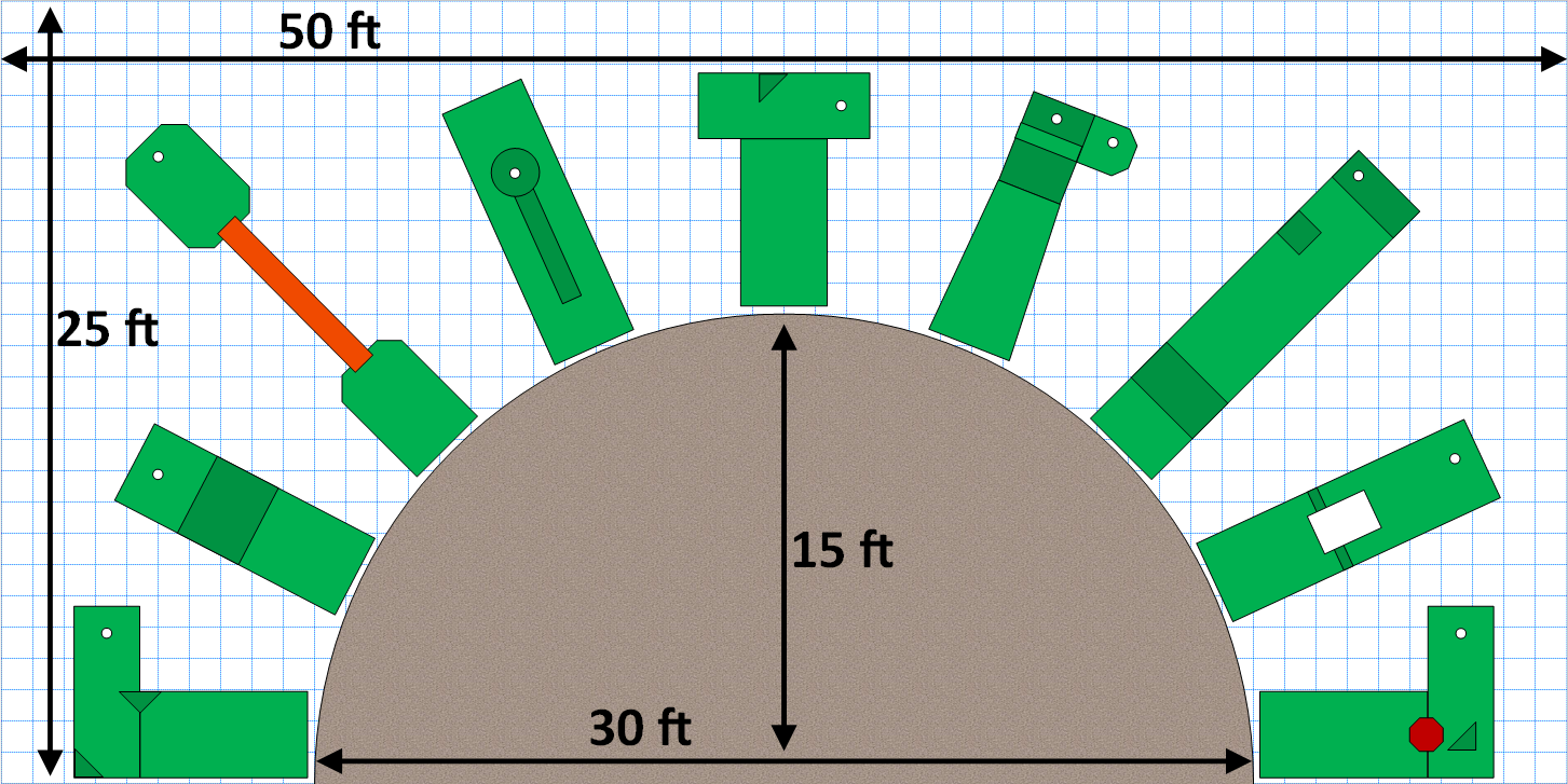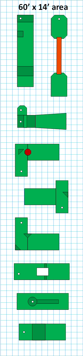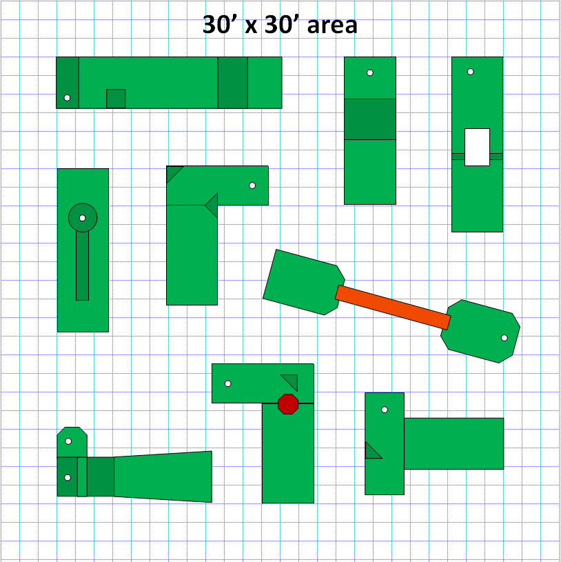 The 9-hole course layout can fit in a under 900 square foot area with just enough room between and around obstacles (2.5’-3’ clearance) that it’s comfortable to play. If more space is available, we’ll expand into 1200-1500+ square feet easily. These scale drawings show example layouts. For reference, the actual width of each green is a little under 3 ft, and the grid represents 1 ft squares.